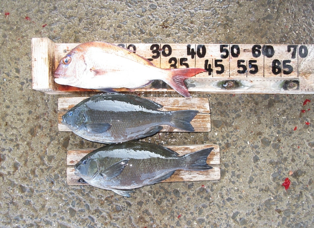 濵﨑さん🙂 真鯛44㎝、クチブトクロ39㎝3枚、38㎝5枚、35㎝を、フカセ釣りで釣られたそうです。その他、クチブトクロ30㎝、オナガクロ足裏サイズも10枚以上釣られたそうですが、リリースされたそうです。合計13枚持ち帰えられてました。