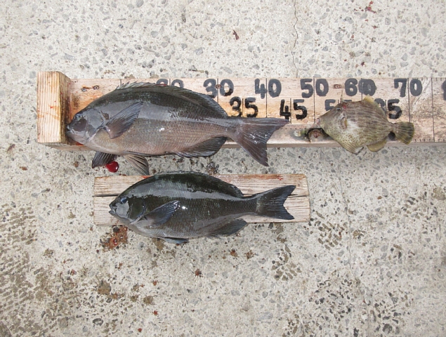 下釜さん🙂 クチブトクロ45㎝(1,20㎏)、良型36,5㎝(0,80㎏)、カワハギを、フカセ釣りで釣られたそうです。