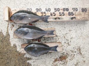 その他の磯瀬では、フカセ釣りのお客様は、チヌ45㎝~40㎝、クチブトクロ38,5㎝、37㎝、35㎝~30㎝を、釣られてました。小ぶりの魚はリリースされたそうです。チヌ45㎝~40㎝、お見事でした✨🎉。