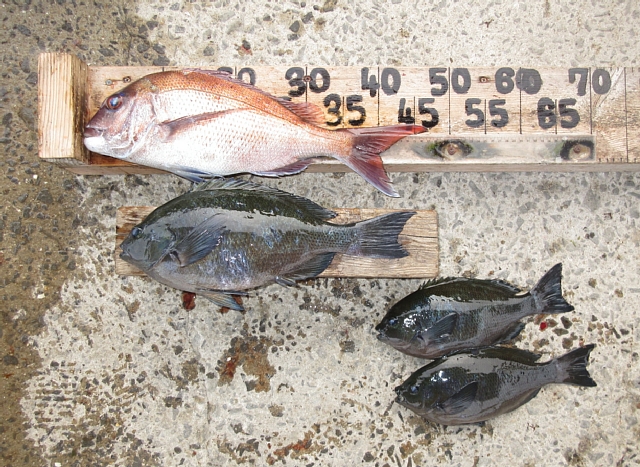 宮﨑さん🙂真鯛42㎝、38㎝を、フカセ釣りで釣られたそうです。その他、チヌ50㎝~45㎝・4枚釣られたそうですが、リリースされたそうです。