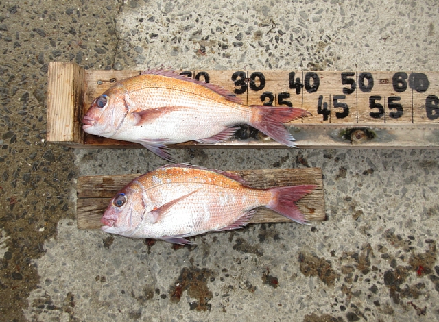 下釜さん🙂真鯛47㎝(1,12㎏)、クチブトクロ39,5㎝(0,90㎏)、32,5㎝を、フカセ釣りで釣られたそうです。