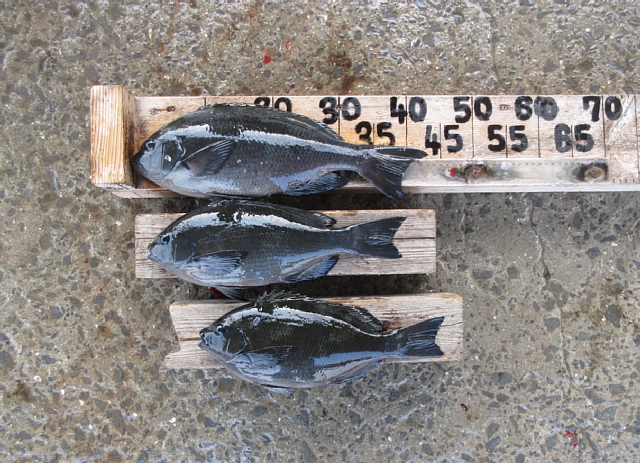 大久保さん🙂 クチブトクロ43㎝、36㎝、35㎝を、フカセ釣りで釣られたそうです。その他、クチブトクロ30㎝級、オナガクロ足裏サイズも釣られたそうですが、リリースされたそうです。