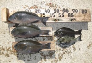 大久保さん🙂 クチブトクロ40㎝、35㎝、34,5㎝、33㎝、30㎝を、フカセ釣りで釣られたそうです。その他、オナガクロ足裏サイズも10枚以上釣られたそうですが、リリースされたそうです。合計9枚持ち帰えられてました。