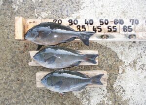 クチブトクロ良型47㎝(1,63㎏)、良型42㎝(1,17㎏)、チヌ42,5㎝、お見事でした✨🎉。
