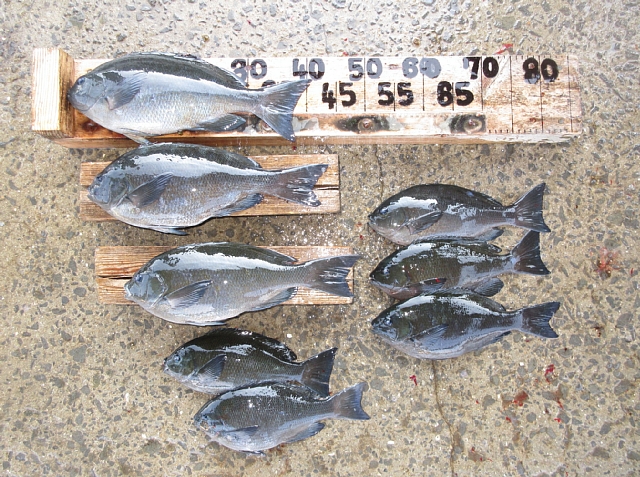大久保さん🙂 クチブトクロ42㎝(1,12㎏)、40㎝(1,0㎏)、39㎝(0,86㎏)、35㎝3枚、32㎝、30㎝を、フカセ釣りで釣られたそうです。その他、オナガクロ足裏サイズも釣られたそうですが、リリースされたそうです。合計8枚持ち帰えられてました。