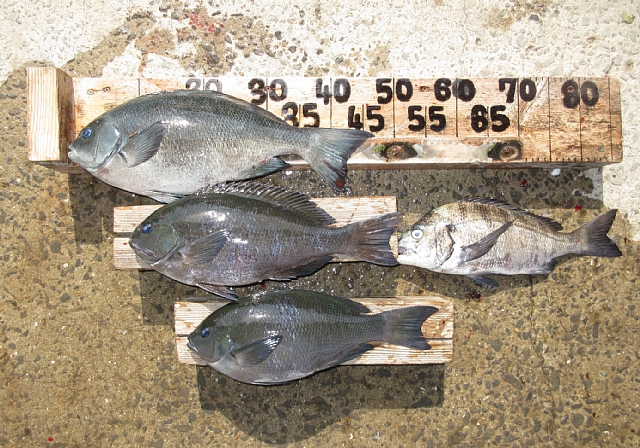 江上さん🙂 クチブトクロ47㎝(1,63㎏)、42㎝(1,17㎏)、良型38㎝(0,91㎏)、チヌ42,5㎝を、フカセ釣りで釣られたそうです。
